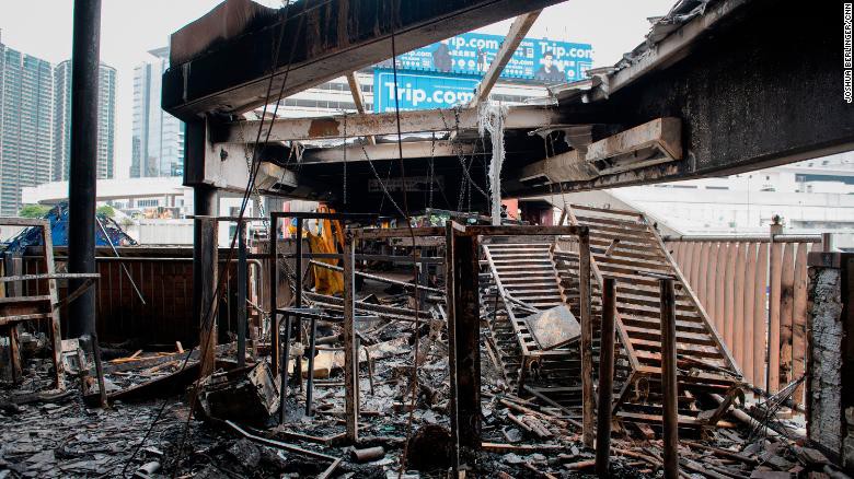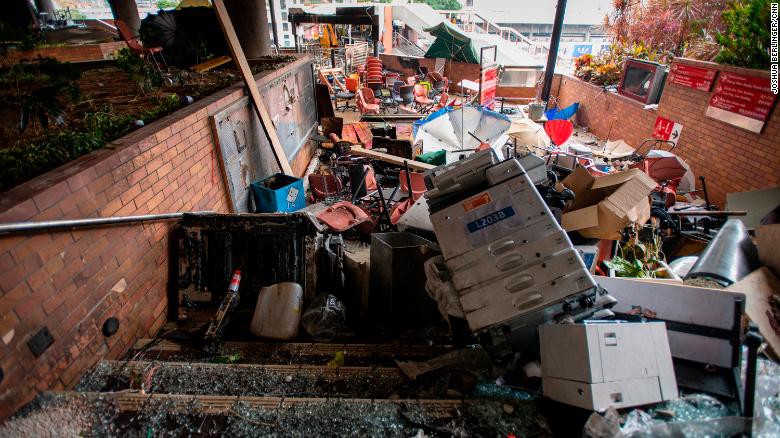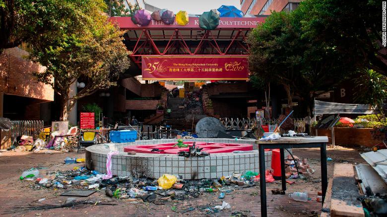 Tại một trong những lối vào của khuôn viên trường, không khí đặc quánh mùi rác rưởi và và mùi xăng. Hàng nghìn quả bom xăng chưa sử dụng nằm la liệt khắp khuôn viên trên đường đến nhà ăn, nơi đã trở thành một trụ sở chính của người biểu tình, theo ghi nhận của CNN.