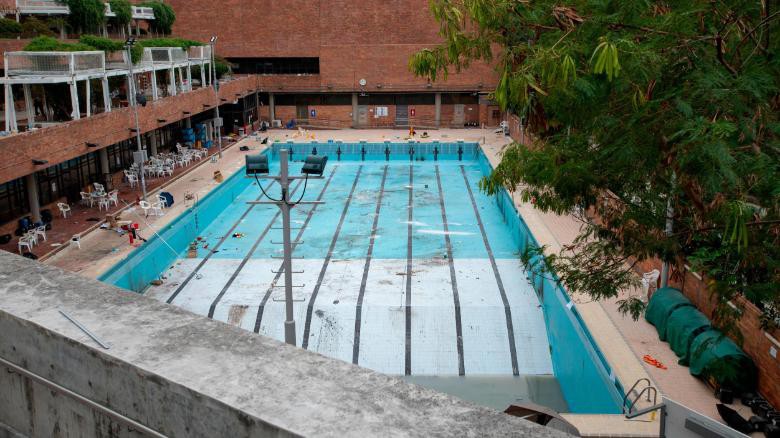 Bể bơi trường Đại học Bách khoa trở thành sân tập ném bom xăng. Ảnh: CNN