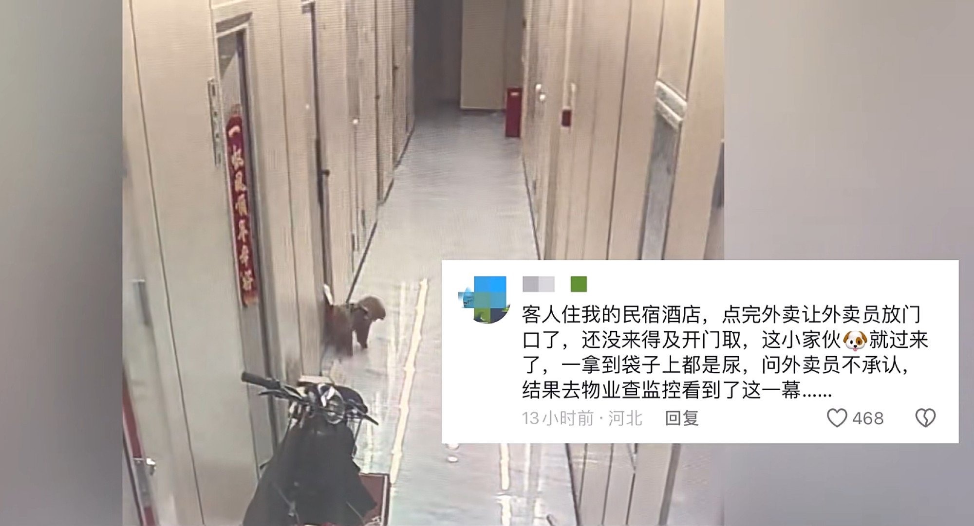 Theo đó, đoạn phim cho thấy hình ảnh người giao hàng đặt thức ăn bên ngoài cửa phòng của cô gái. Và khoảng 1 phút sau, camera ghi lại cảnh một chú chó đi về phía túi thức ăn và thực hiện hành vi tè bậy của mình.