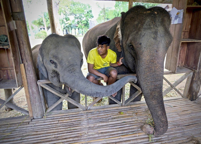 Hai chú voi Mae Laem Tong và Mae Kamphet tìm đồ ăn trong đống cỏ ở Làng Voi Luông Pha Bang. Hai chú voi này đã "thất nghiệp" sau khi chính quyền cấm xuất khẩu gỗ vào năm 1999 nhằm chống nạn chặt phá trái phép. Hiện tại, hai chú voi nghỉ hưu được nuôi và tắm bởi những người khách du lịch tới thăm ngôi làng, sau đó được đưa trở về rừng vào mỗi buổi tối.