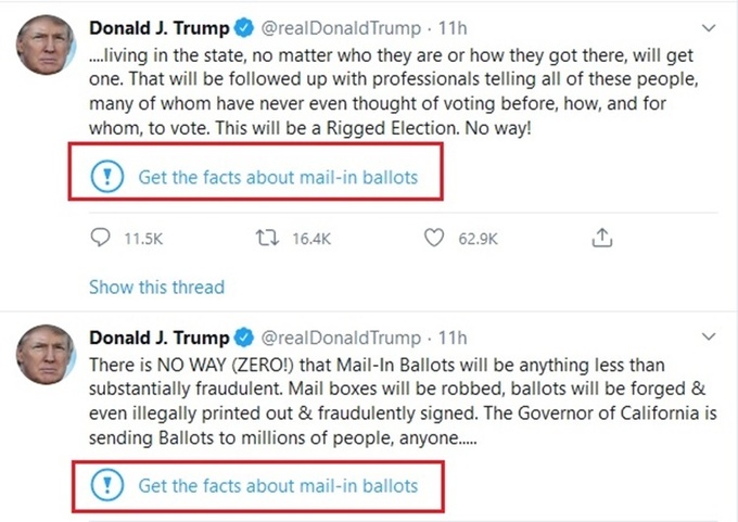 Theo đó, những nội dung mà Tổng thống Trump đăng tải đã vi phạm chính sách của Twitter, trong đó cấm người dùng "thao túng hoặc can thiệp vào các cuộc bầu cử hay những quy trình dân sự khác", như đăng thông tin sai lệch khiến mọi người từ chối đi bỏ phiếu, một phát ngôn viên công ty xác nhận.