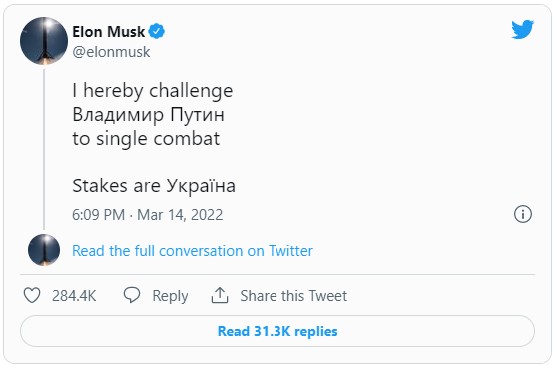 "Tôi xin gửi lời thách đấu đơn đến Tổng thống Vladimir Putin." Tỷ phú Elon Musk viết trên Twitter vào sáng 14/3. "Phần thưởng cá cược là Ukraine."