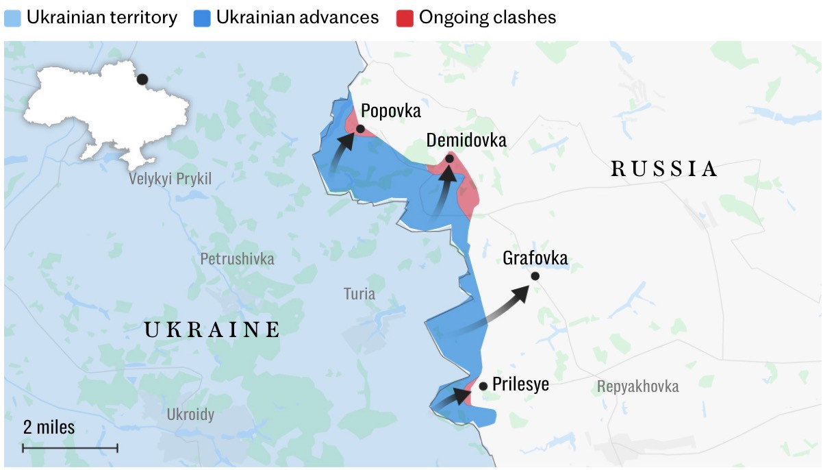 Theo Viện Nghiên cứu chiến tranh, một tổ chức tư vấn của Mỹ, giao tranh ác liệt hiện diễn ra ở Demidovka, Popovka và Prilessye. Quân Ukraine cũng thực hiện một loạt vụ không kích chính xác, nhắm vào các sở chỉ huy, cầu, trực thăng và nhà kho của đối phương.