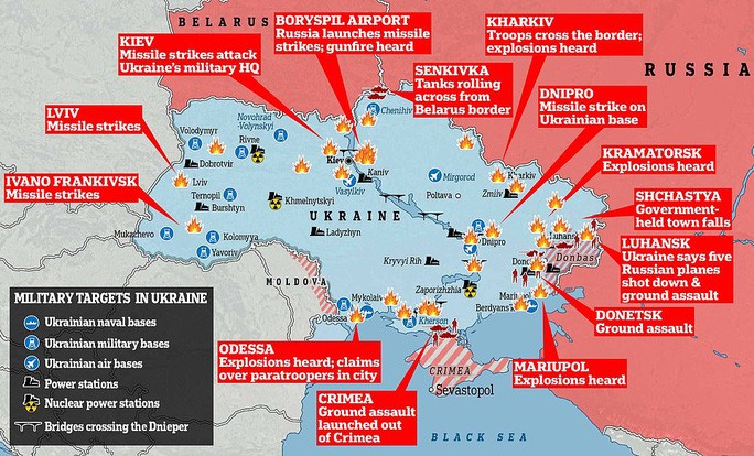 Theo Daily Mail, Nga phát động chiến dịch quân sự với các cuộc tấn công đồng thời từ phía Nam, Đông và Bắc Ukraine, bằng cả đường bộ lẫn đường hàng không. Tên lửa và bom được nhìn thấy trút xuống từ bầu trời. Xe tăng ào ạt đổ qua biên giới vào Ukraine, lính dù đổ bộ các khu vực phía Đông và các vụ nổ được báo cáo trên khắp Ukraine ngày 24-2.