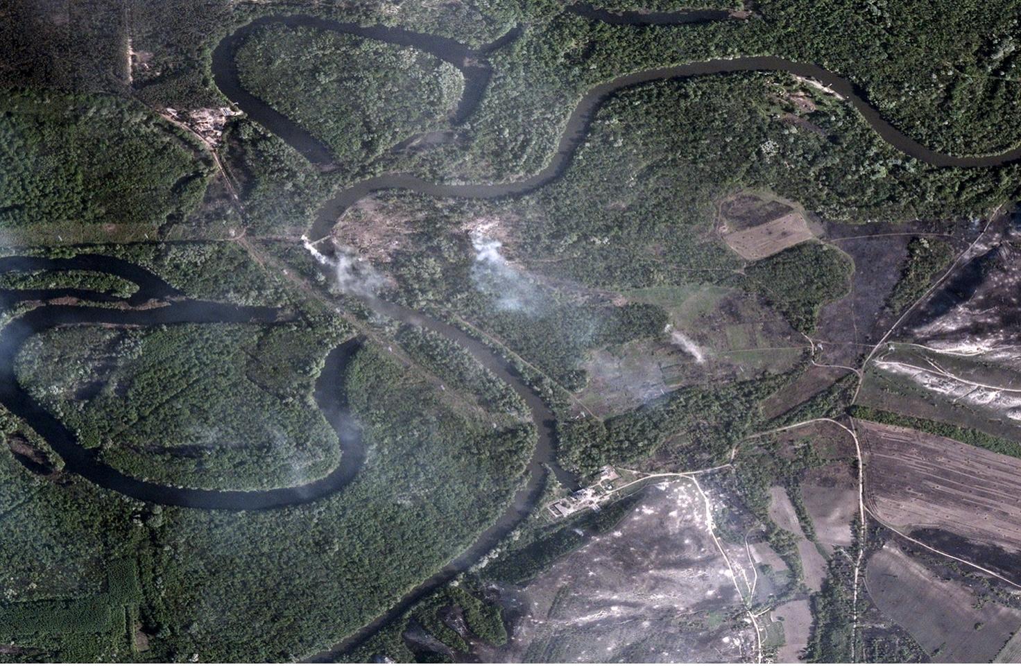 Khói bốc lên từ bờ tây của sông Siverskyi Donets và phía cuối của cây cầu. Ở bờ phía đông, các miệng hố và khói cũng xuất hiện, gồm cả ở những chỗ quanh xe quân sự Nga đã băng qua.