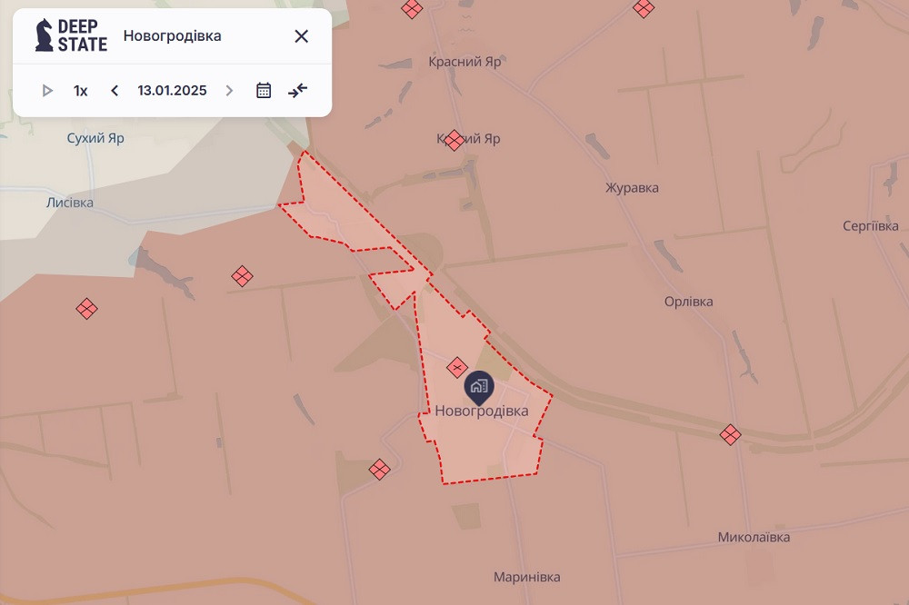 Theo dữ liệu cập nhật từ trang Deep State của Ukraine hôm 12/1, khu vực ngoại vi tây bắc thành phố Novohrodivka nằm ngay sát tiền tuyến, nơi vẫn diễn ra các cuộc giao tranh giữa Nga và Ukraine.