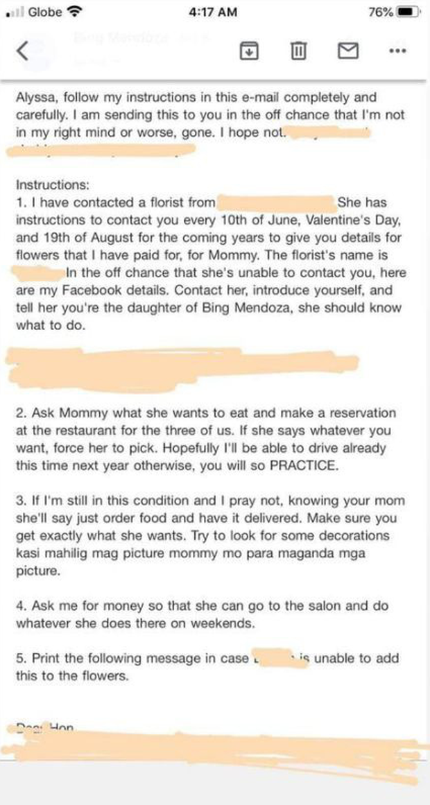 Đã 3 giờ sáng, trong nhà chỉ còn mỗi Alyssa Mendoza còn thức. Cô đang cố lấy hết cản đảm để mở email mình nhận được từ bố vào 2 ngày trước đó. Điều đáng nói, người cha của Mendoza là ông Bing Mendoza, đã qua đời cách đây 10 tháng.