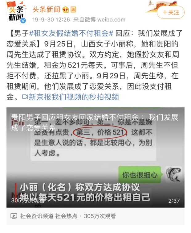 Nạn nhân trên đây đều là người đi thuê, nhưng đừng lầm tưởng rằng người cho thuê sẽ bình an vô sự. Anh Chu, người Quý Dương (Quý Châu, Trung Quốc) tìm được 1 em gái xinh đẹp, yêu cầu cô ấy giả vờ kết hôn với mình, tiền thuê mỗi ngày 521 tệ (gần 2 triệu đồng).