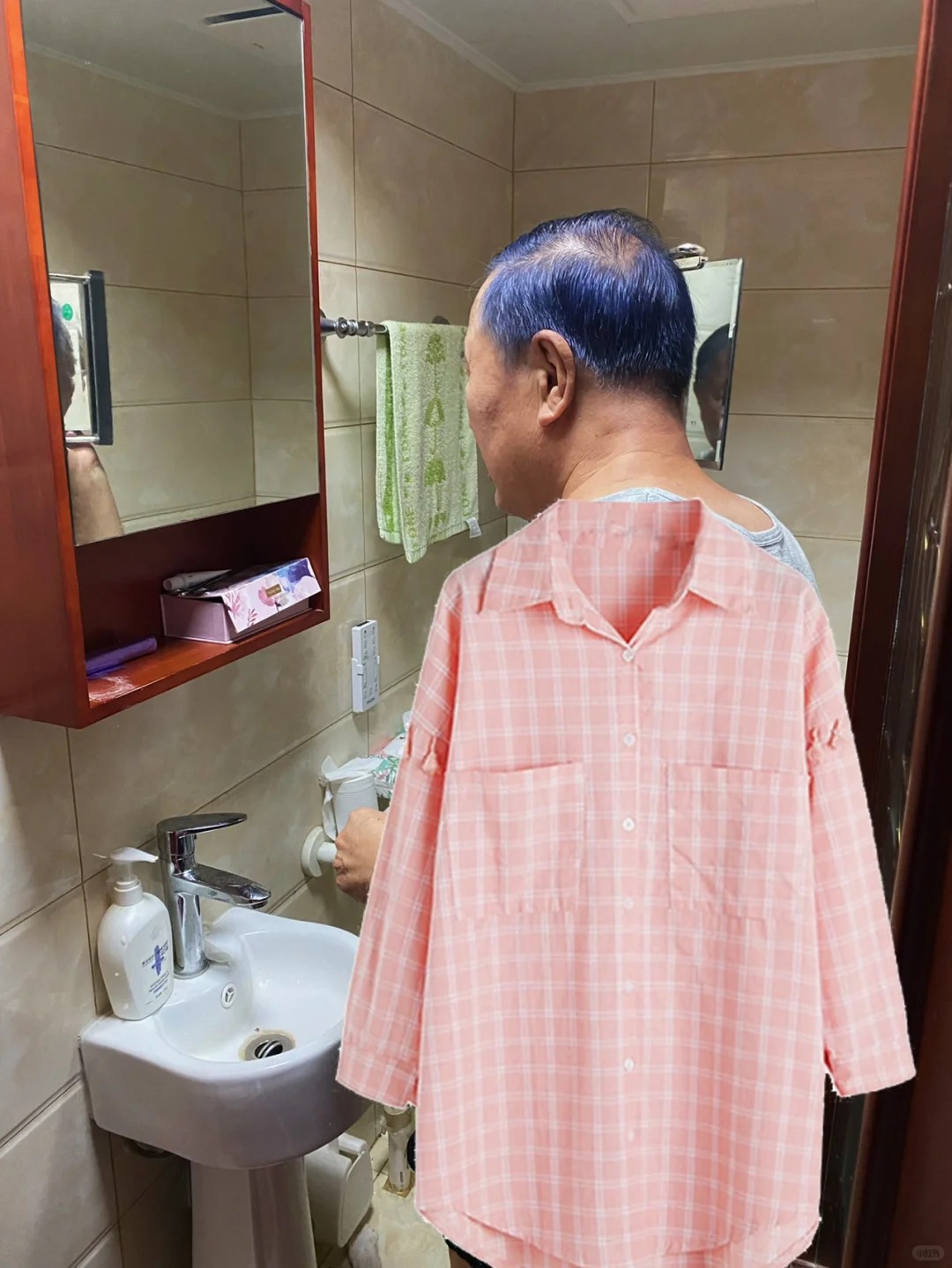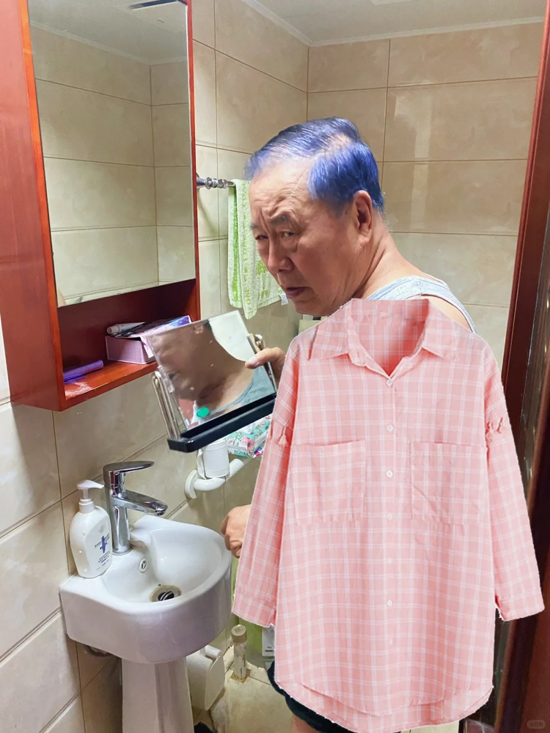 Trong khoảnh khắc được cô gái chụp lại, ông ngoài đang đứng soi gương ở nhà vệ sinh với mái tóc xanh lét, không quên nhìn cháu gái với ánh mắt “ông hiền quá rồi phải không?”.