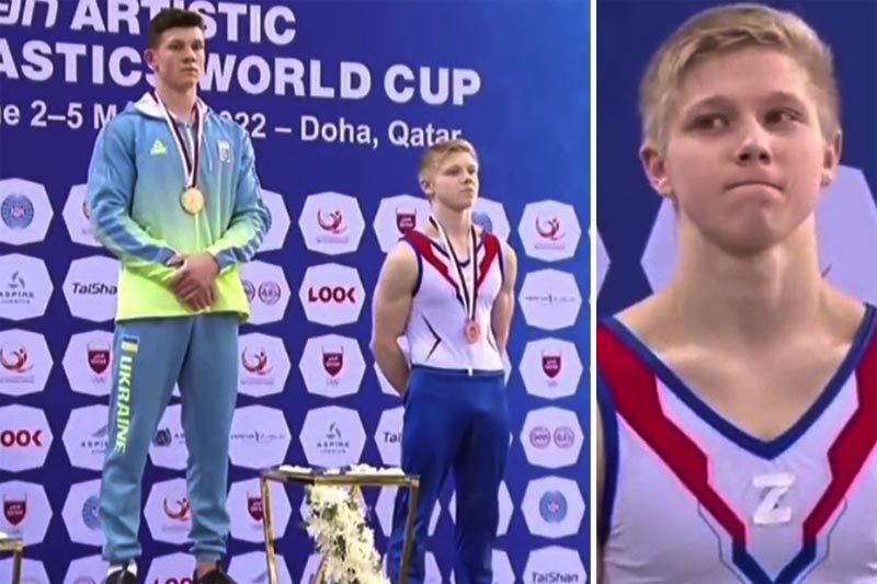 Một ngày sau, hôm 5/3, vận động viên thể dục dụng cụ người Nga, Ivan Kuliak (phải) mặc áo in chữ Z khi anh đứng cạnh vận động viên Kovtun Illia của Ukraine, người đoạt huy chương vàng tại giải vô địch thế giới ở Doha.