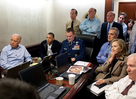 Tổng thống Barack Obama cùng với Phó tổng thống Joe Biden cùng các cộng sự thân cận theo dõi chiến dịch tiêu diệt Bin Laden. |