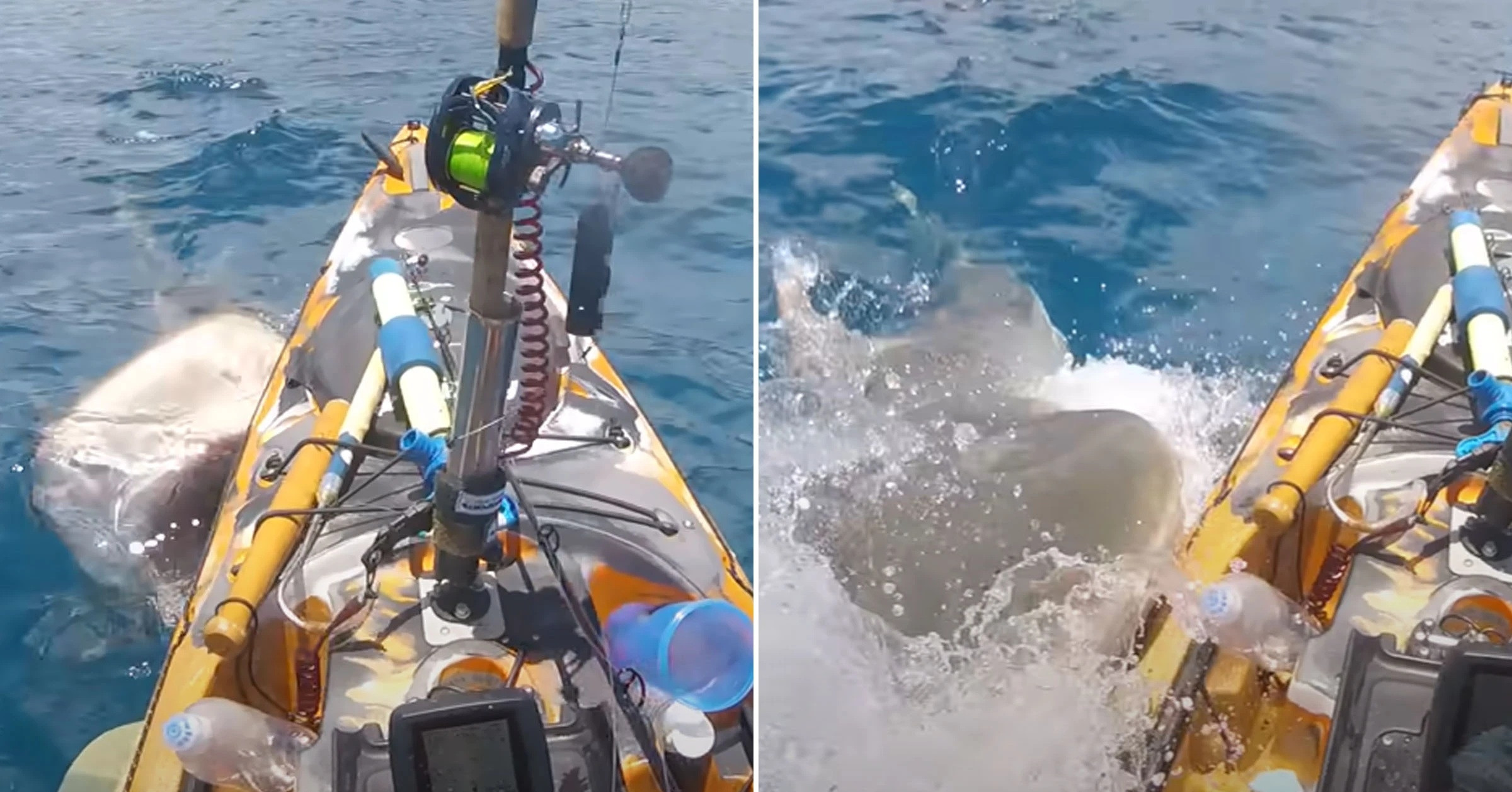 Con cá mập hổ sau đó lao mạnh vào thuyền kayak, và thậm chí còn cắm cả hàm răng vào mạn thuyền, khiến ông Haraguchi phải hét lên trong hoảng sợ.