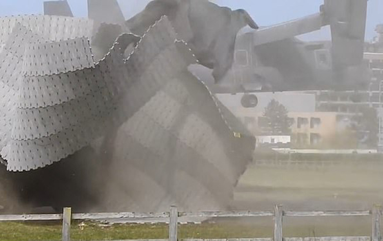 Nguyên nhận là do lực đẩy quá mạnh từ cánh quạt trực thăng CV-22B Osprey của Không quân Mỹ đã thổi bay thảm cao su ở bãi đáp trực thăng. Không có thương tích nào được báo cáo từ vụ việc.