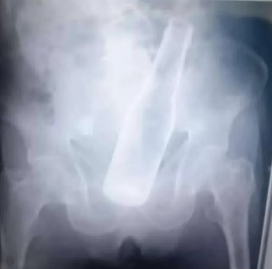 Bệnh nhân được đưa tới bệnh viện La Ovallera trong tình trạng đau đớn. Ảnh chụp X-quang cho thấy vỏ chai bia mắc kẹt trong hậu môn của bệnh nhân.