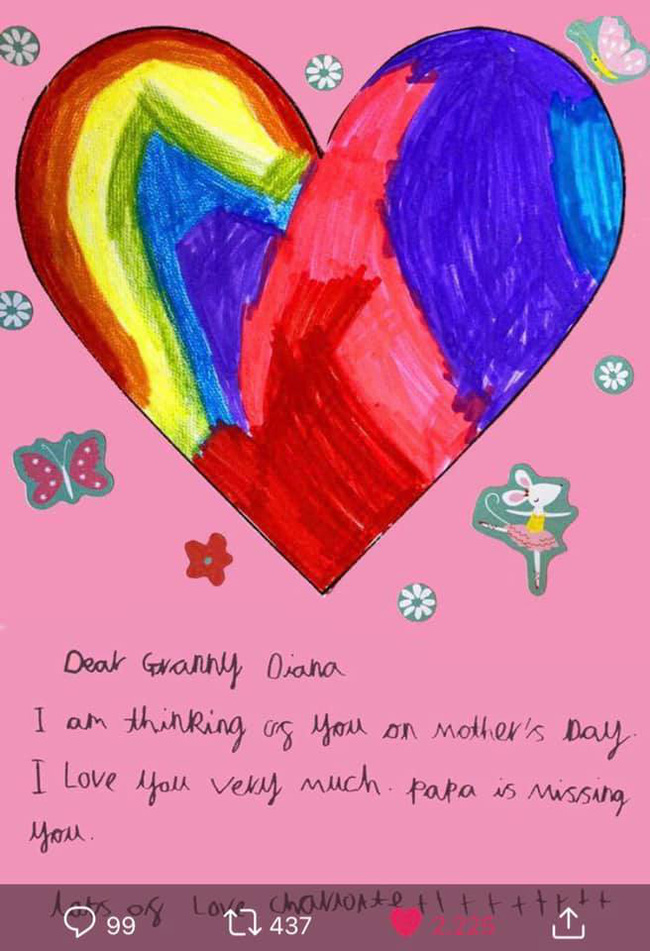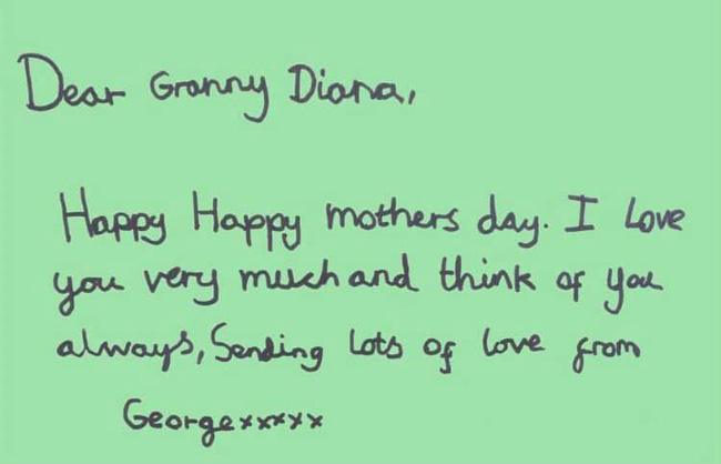 Gửi bà nội Diana! Chúc bà Ngày của Mẹ thật hạnh phúc. Cháu yêu bà rất nhiều và luôn nhớ đến bà. Gửi bà muôn vàn yêu thương! George.