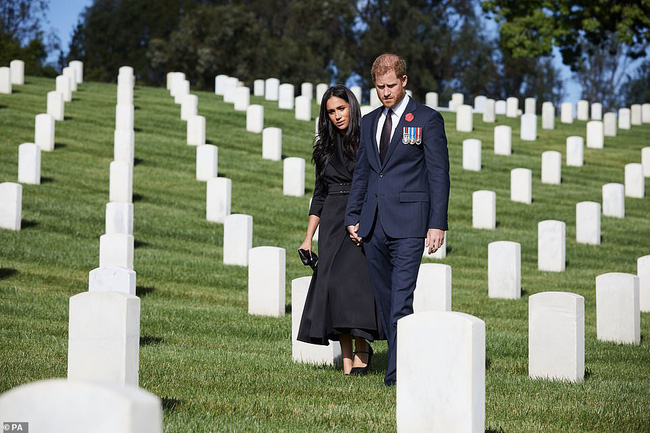 Những bức hình được chia sẻ trên truyền thông cho thấy, nhà Sussex mặc trang phục tối màu, nắm tay nhau đi đến nghĩa trang vào hôm 8/11. Harry đã đem một vòng hoa tới nghĩa trang với dòng chữ: "Gửi đến tất cả những người đã và đang phục vụ vì đất nước. Cảm ơn các bạn!". Meghan đồng hành bên cạnh Harry thực hiện tưởng niệm tại nghĩa trang.