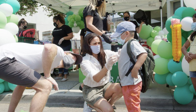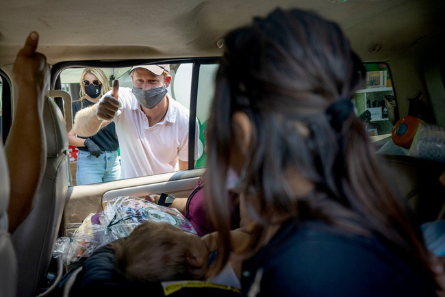 Cùng ngày 21/8, Omid Scobie, bạn thân của Meghan cũng đăng bài viết mới trên Twitter, xác nhận nhà Sussex đi làm từ thiện giúp đỡ trẻ em và các gia đình địa phương có hoàn cảnh khó khăn bằng việc phân phát các đồ dùng thiết yếu. Những bức ảnh được chia sẻ trên truyền thông cho thấy, Meghan và Harry ăn vận thoải mái với quần short kaki và áo trắng, giày thể thao cũng như đeo khẩu trang, găng tay kỹ càng. Giữa trời nắng nóng, họ đứng trao các món đồ từ thiện và giao lưu với các gia đình có em nhỏ.
