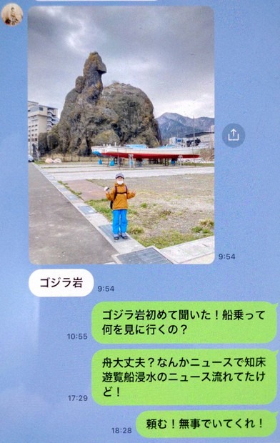 Người đàn ông trả lời tin nhắn của vợ gần một tiếng sau khi tàu Kazu I rời cảng ở thị trấn Shari để du ngoạn dọc bán đảo Shiretoko: "Anh chưa bao giờ nghe nói về tảng đá Godzilla! Hai mẹ con thấy gì trên thuyền?" Tuy nhiên anh ấy đã không bao giờ nhận được hồi âm được nữa.