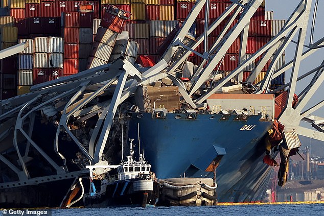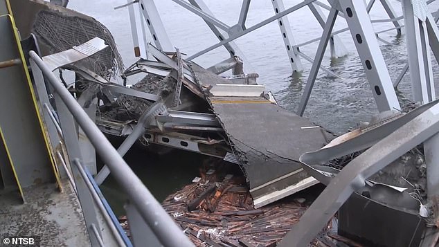 Theo đoạn phim từ trên tàu do các nhà điều tra của Cục An toàn Giao thông Quốc gia công bố, sau khi đổ sập, một phần lớn của cây cầu đã gần như xé toạc phần mũi của con tàu Dali. Xung quanh là một đống kim loại méo mó biến dạng xếp chồng lên nhau. Trong khi đó, một số container trên con tàu đã bị phá hủy, đè nát hoàn toàn, tạo nên cảnh tượng như trong các bộ phim hậu tận thế.