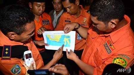 Các thành viên trong lực lượng cứu hộ đang xác định vị trí của nạn nhân chuyến bay QZ8501 trên bản đồ. |