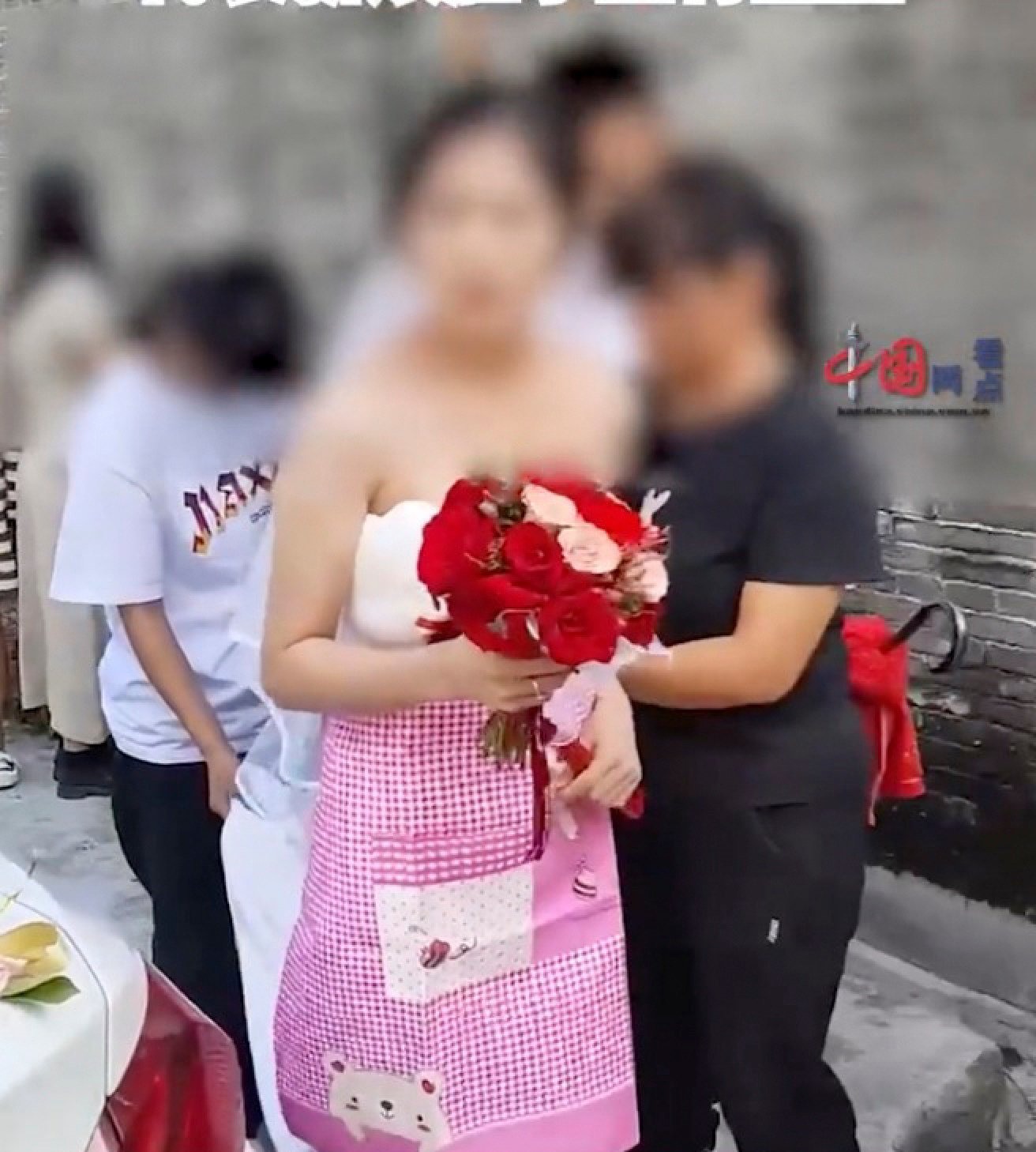 Theo Sina, cô dâu trong đoạn video không được tiết lộ danh tính đến từ tỉnh Quảng Đông, miền Đông Nam Trung Quốc lúc này đang cầm một bó hoa hoa hồng vừa bước xuống từ xe hoa thì bất ngờ có hai người phụ nữ tiến tới để đeo một chiếc tạp dề cho cô.