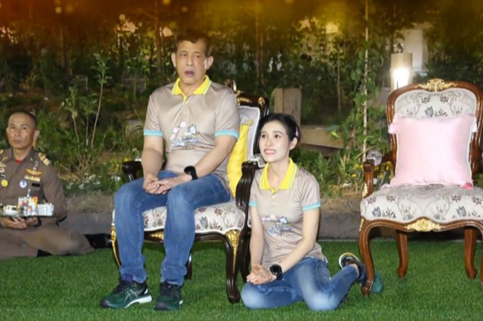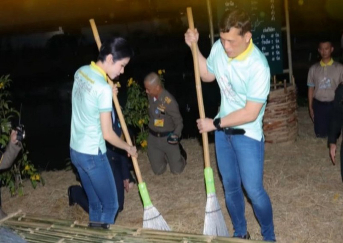 Nhà vua 68 tuổi của Thái Lan mặc quần bò bó sát cùng nàng thiếp mới được phục vị cầm chổi quét sân nhà tù, trong khi các quan chức quỳ xung quanh.