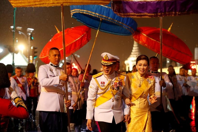 Khi rời cung điện chiều hôm đó, Vua Vajiralongkorn và Hoàng hậu Suthida cũng vẫy chào và mỉm cười trước hàng nghìn người ủng hộ đang đứng dưới mưa. Họ mặc áo vàng, cầm hoa và ảnh của nhà vua quá cố. Phía bên kia đường, hàng trăm người biểu tình đụng độ với cảnh sát và hò hét đòi thả những người bị bắt giữ.