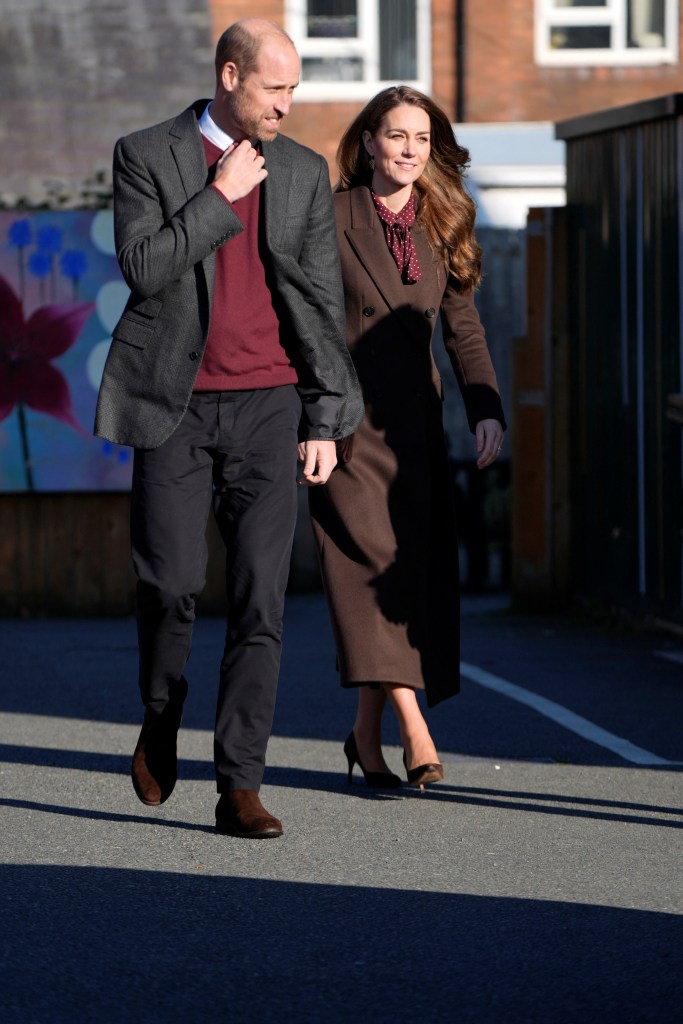 Vương phi Kate diện áo khoác dài màu nâu kết hợp cùng giày cao gót và váy chấm bi màu đỏ nâu hạt dẻ. Trong khi đó, Thân vương William mặc trang phục có màu sắc đồng điệu. Thân vương xứ Wales diện bộ vest xám, áo len màu hạt dẻ và giày nâu, đặc biệt là bộ râu mà anh đã để từ mùa hè. Chuyến thăm của họ diễn ra một tháng sau khi Vương phi Kate chia sẻ trong một video trên mạng xã hội X về “sự nhẹ nhõm” mà cô cảm thấy khi kết thúc hóa trị.