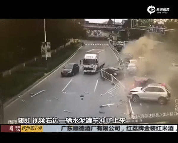 Được biết, trong lúc các phương tiện giao thông đang dừng lại chờ đèn đỏ, một chiếc xe máy trộn bê tông dường như bị mất lái đã đâm sầm vào chiếc xe phía trước với lực cực mạnh, khiến cho chiếc xe xấu số này theo đà đâm dây chuyền vào những chiếc xe đang đỗ gần đó và kéo theo hàng chục cú va chạm khác.
