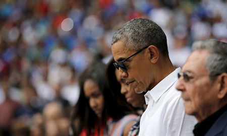 Tổng thống Mỹ Barack Obama (áo trắng) và Chủ tịch Cuba Raul Castro (phải) dành một phút mặc niệm cho nạn nhân vụ khủng bố Bỉ trước khi trận đấu bóng chày diễn ra. Ảnh: Reuters |