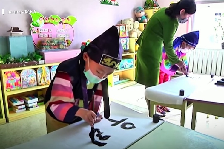 Các em học sinh được giáo viên hướng dẫn thư pháp. Ảnh: Reuters/KCNA