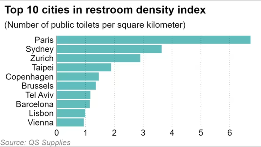 Thực tế, đây cũng là vấn đề về kinh tế xã hội của mỗi thành phố, bởi các nơi dẫn đầu về mật độ nhà vệ sinh công cộng cao trên km2 hầu hết là đều giàu có và phát triển. Các thành phố như thể phải kể đến Paris (Pháp), Zurich (Thụy Sĩ), Barcelona (Tây Ban Nha), Lisbon (Bồ Đào Nha) hay Vienna (Áo). Ngược lại, nhóm thành phố nhóm dưới cùng chủ yếu ở châu Phi hoặc châu Á vốn các nước đang phát triển.