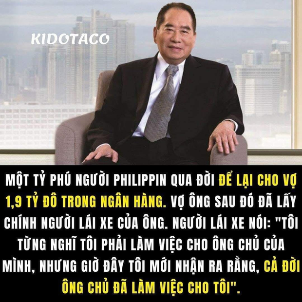 Trong thời gian qua, mạng xã hội trong nước đã lan truyền câu chuyện một tỷ phú Philippines qua đời để lại tài sản khủng cho vợ. Sau đó người vợ đã lấy tài xế của chồng. Người lái xe đã phát biểu một câu để đời rằng: "Tôi từng nghĩ tôi phải làm việc cả đời cho ông chủ của mình nhưng giờ tôi nhận ra, cả đời ông chủ đã làm việc cho tôi".