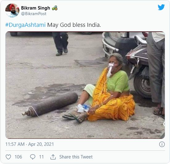 Mới đây, cư dân mạng cũng liên tục chia sẻ bức ảnh một cụ bà ngồi thất thần trên đường với chiếc bình oxy nằm lăn lóc bên cạnh. Hình ảnh này quả thực rất có sức lay động trong bối cảnh người dân Ấn Độ đang phải gồng mình chống chọi với "sóng thần" Covid-19.