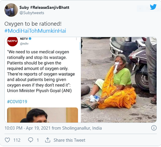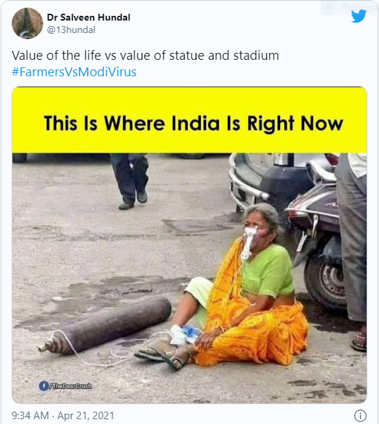 Bức ảnh cũng được nhà báo Aarif Shah chia sẻ trên Twitter với chú thích: "Đây là điều đang diễn ra ở Ấn Độ, ngay bây giờ." Dòng tweet đã thu hút hơn 2.500 lượt thích và hơn 1.000 người chia sẻ. Nhiều người khác cũng đã chia sẻ hình ảnh trên Twitter, với các chú thích khác nhau chỉ trích Thủ tướng Ấn Độ Narendra Modi và chính phủ.