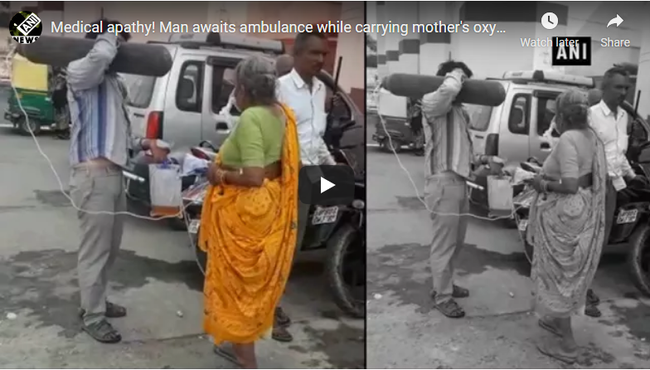 Theo báo cáo, một người đàn ông được cho là đang đợi xe cấp cứu tại Trường Cao đẳng Y tế Agra của Uttar Pradesh trong khi mang theo một bình oxy để giúp mẹ anh duy trì sự sống.