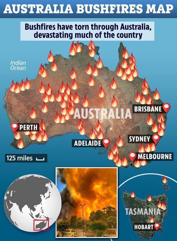 Thảm họa cháy rừng ở Úc đang trở thành nỗi đau của người dân nước này. Theo thống kê tại Đại học Sydney, tính đến hôm qua đã có hơn 500 triệu cá thể động vật xác nhận đã chết. Ước tính mỗi phút trôi qua có hơn 12 cá thể động vật tử vong, mỗi phút con người cảm nhận được sự bình yên thì trong lúc này thì ở Australia hàng ngàn con vật đang gào thét trong tuyệt vọng.