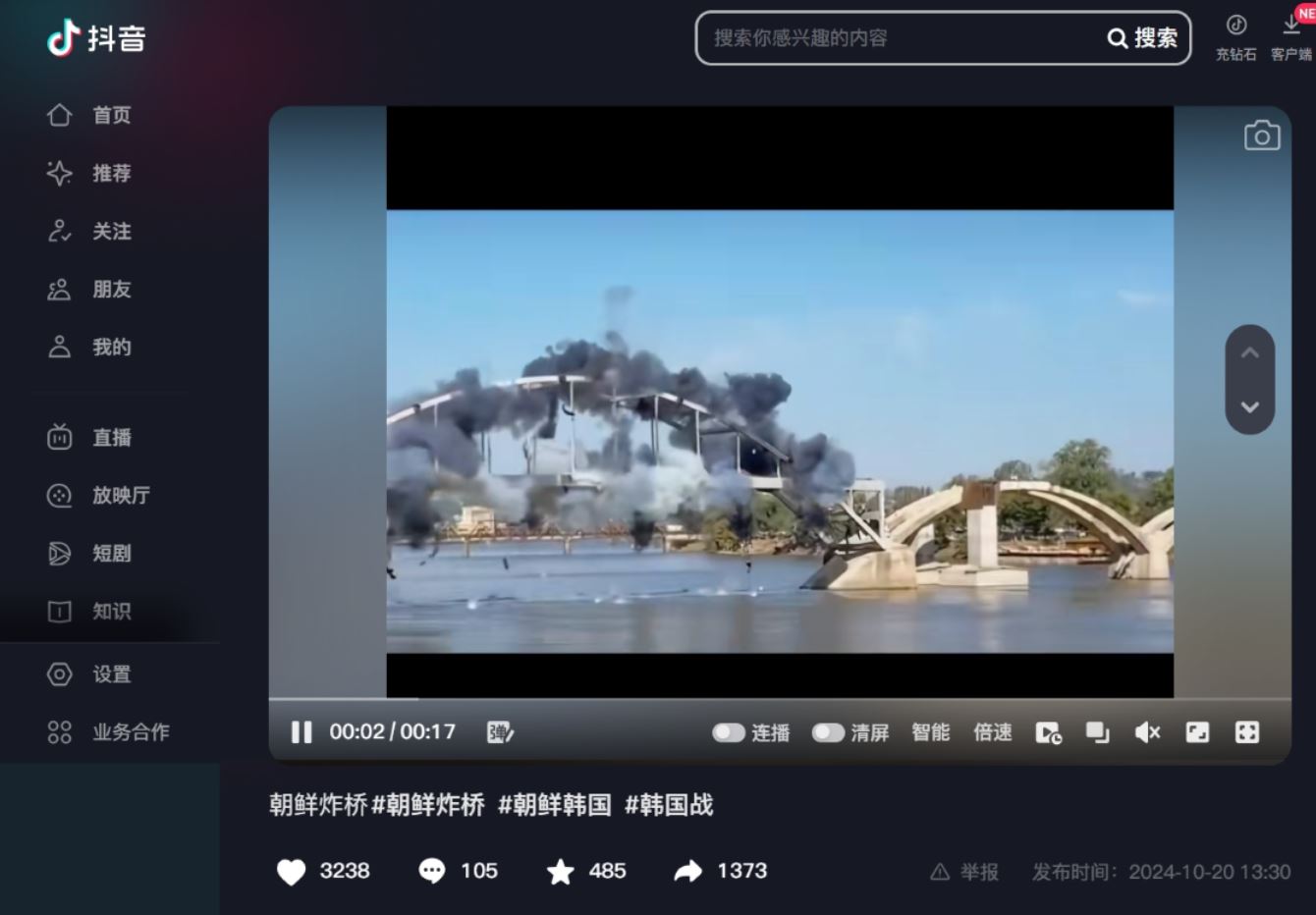 "Triều Tiên đã cho nổ tung cây cầu #Triều Tiên Hàn Quốc #Chiến tranh Triều Tiên", một bài đăng bằng tiếng Trung giản thể được chia sẻ gần đây trên nền tảng xã hội Douyin - phiên bản Trung Quốc của TikTok, hãng tin AFP (Pháp) ngày 29/10 đưa tin.