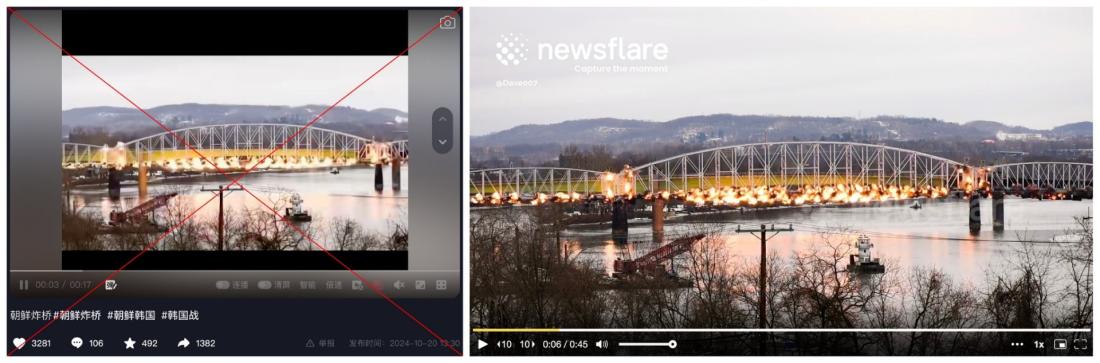 Theo AFP, đoạn clip thứ hai trong video tổng hợp được lan truyền trên mạng xã hội trên thực tế được cắt ra từ một video về cảnh phá dỡ một cây cầu ở Pittsburgh, bang Pennsylvania, Mỹ, vào năm 2016.