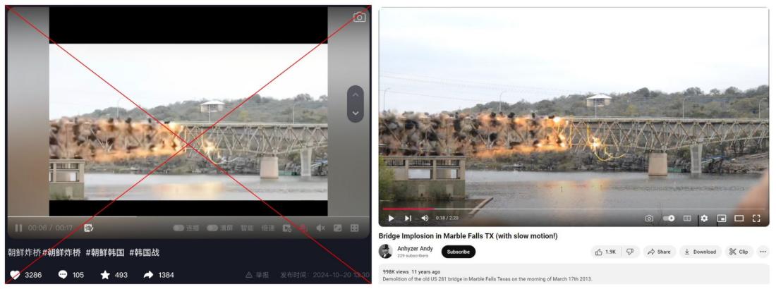 AFP đưa tin, đoạn clip thứ ba trong video tổng hợp được lấy từ một video đăng trên YouTube vào tháng 3/2013 với chú thích rằng: "Phá dỡ cầu cũ US 281 ở Marble Falls, Texas".