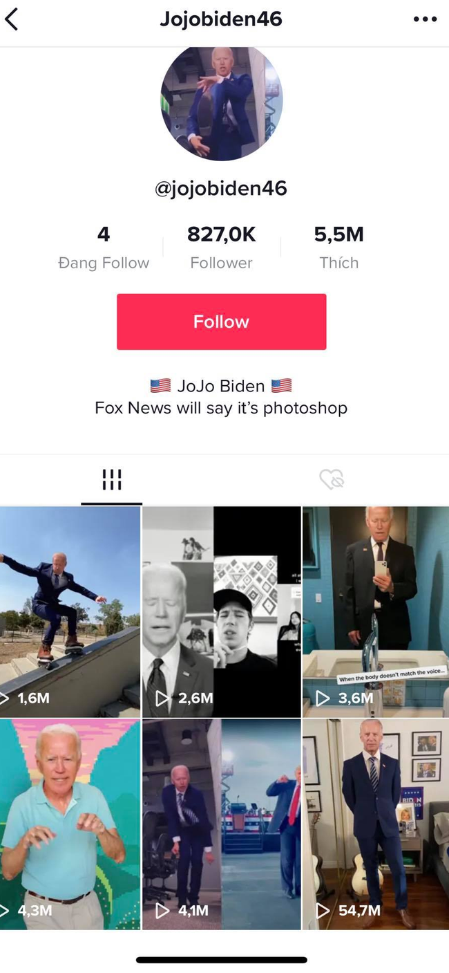 Mới đây, trên mạng xã hội bất ngờ xuất hiện tài khoản TikTok có tên @jojobiden46. Ở đó, người ta thấy hình ảnh không Joe Biden nhưng lại ở phong thái hoàn toàn khác. Vẫn khuôn mặt ấy nhưng dường như ông đã trẻ ra cả vài chục tuổi, ông nhảy hiện đại, trượt patin điệu nghệ như những thanh niên tuổi đôi mươi.