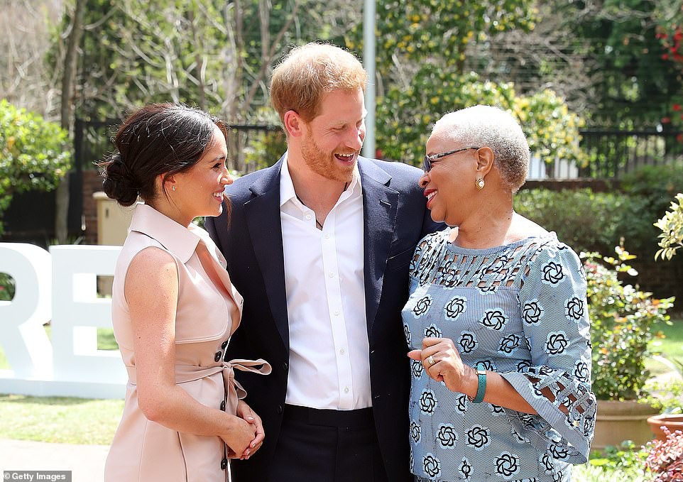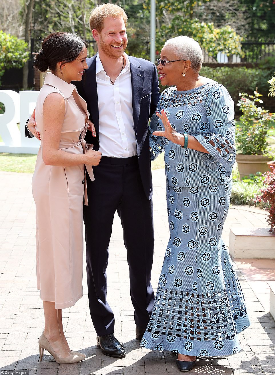 Meghan tiếp tục diện một chiếc đầm có thiết kế đính hàng cúc ở phía trước và thắt eo thuộc thương hiệu House of Nonie. Cặp đôi hoàng gia tỏ ra vui vẻ và thân thiết với bà Graca Machel. Nữ công tước xứ Sussex còn được nhìn thấy nắm chặt tay bà Graca Machel một cách đầy tình cảm khi cả hai cùng bước vào bên trong.