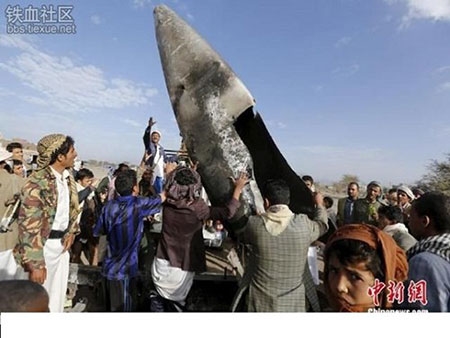 Người dân Yemen vây kín một xác máy bay được cho là của Liên quân các nước Ả Rập bị bắn hạ hôm 24-5-2015 |