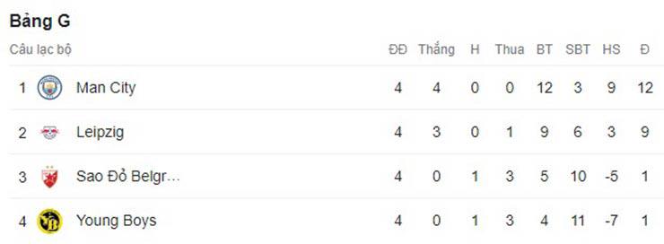 Bảng G như vậy đã gần như xong sớm, Man City đã có 12 điểm ở vị trí dẫn đầu trong khi Leipzig 9 điểm đứng thứ nhì, Young Boys và Sao Đỏ Belgrade đều chỉ có 1 điểm nhưng Sao Đỏ đứng trên do hơn hiệu số. Nói là "gần như" vì còn 2 lượt trận nữa để phân định ai đứng đầu bảng (để xếp nhóm hạt giống vòng knock-out) còn hai đội bị loại sẽ quyết chiến ở lượt sau để tranh vé xuống Europa League.