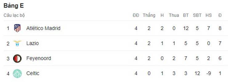 Các bảng còn lại chưa có bảng đấu nào ngã ngũ. Bảng E về cơ bản Celtic đã đứng ngoài cuộc chơi vì chỉ có 1 điểm nhưng cách biệt giữa Atletico Madrid, Lazio và Feyenoord lần lượt chỉ là 1 điểm nên cuộc chiến cho 2 tấm vé đi tiếp vẫn rất căng thẳng. Tương tự là bảng H, Barcelona thua trước Shakhtar Donetsk khiến đội bóng Ukraine này sống lại hy vọng đi tiếp với 6 điểm sau 4 trận, chỉ kém Barca và Porto 3 điểm, trong khi Antwerp toàn thua.