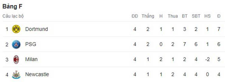 Bảng F thực sự xứng tầm bảng "tử thần" bởi sau 2 lượt trận gần nhất tình thế đã thay đổi. Newcastle sau chiến thắng oanh liệt trước PSG đã thua cả 2 trận gặp Dortmund và rơi xuống cuối bảng, trong khi Dortmund đã leo lên ngôi đầu và PSG với AC Milan lần lượt xếp sau. AC Milan trước lượt đấu này có nguy cơ bị loại nhưng trận thắng PSG 2-1 khiến họ chỉ kém PSG 1 điểm.