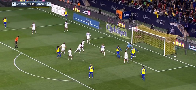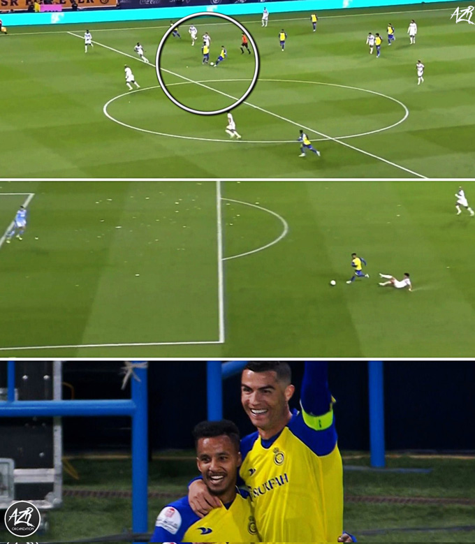 Trong đó, pha kiến tạo để giúp Al Nassr mở tỷ số ấn tượng hơn cả. Đó là tình huống Al Nassr tổ chức phản công. Ronaldo nhận thấy Abdulrahman Ghareeb đang băng lên và anh quyết định tung ra đường chọc khe tuyệt vời bằng chân phải vượt qua sự truy cản của nhiều hậu vệ Al Taawoun. Sau đó, Ghareeb đã bình tĩnh dứt điểm tung lưới đối thủ.