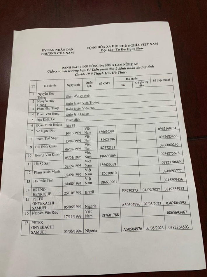 Cụ thể, 34 cầu thủ và thành viên ban huấn luyện SLNA sẽ phải tiến hành cách ly do tiếp xúc với trường hợp là F1 của bệnh nhân Covid-19.