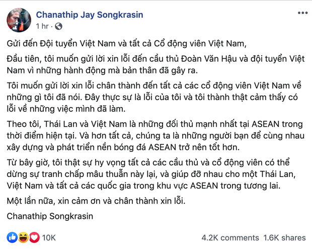 Ngay lập tức, facebook cá nhân của tiền vệ sinh năm 1993 trở thành địa điểm để cư dân mạng Việt Nam vào bình luận, "tấn công". Chanathip phải viết một bức thư xin lỗi cầu thủ và CĐV Việt Nam sau đó để trấn an dư luận.