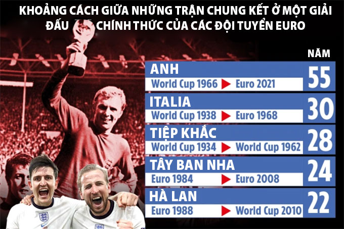 Một con số cũng rất đáng chú ý là ĐT Anh đã phải di chuyển 140.000 dặm (hơn 225300 km) và thi đấu ở 52 quốc gia trên 4 châu lục để có lần đầu vào chung kết 1 giải lớn sau năm 1966.